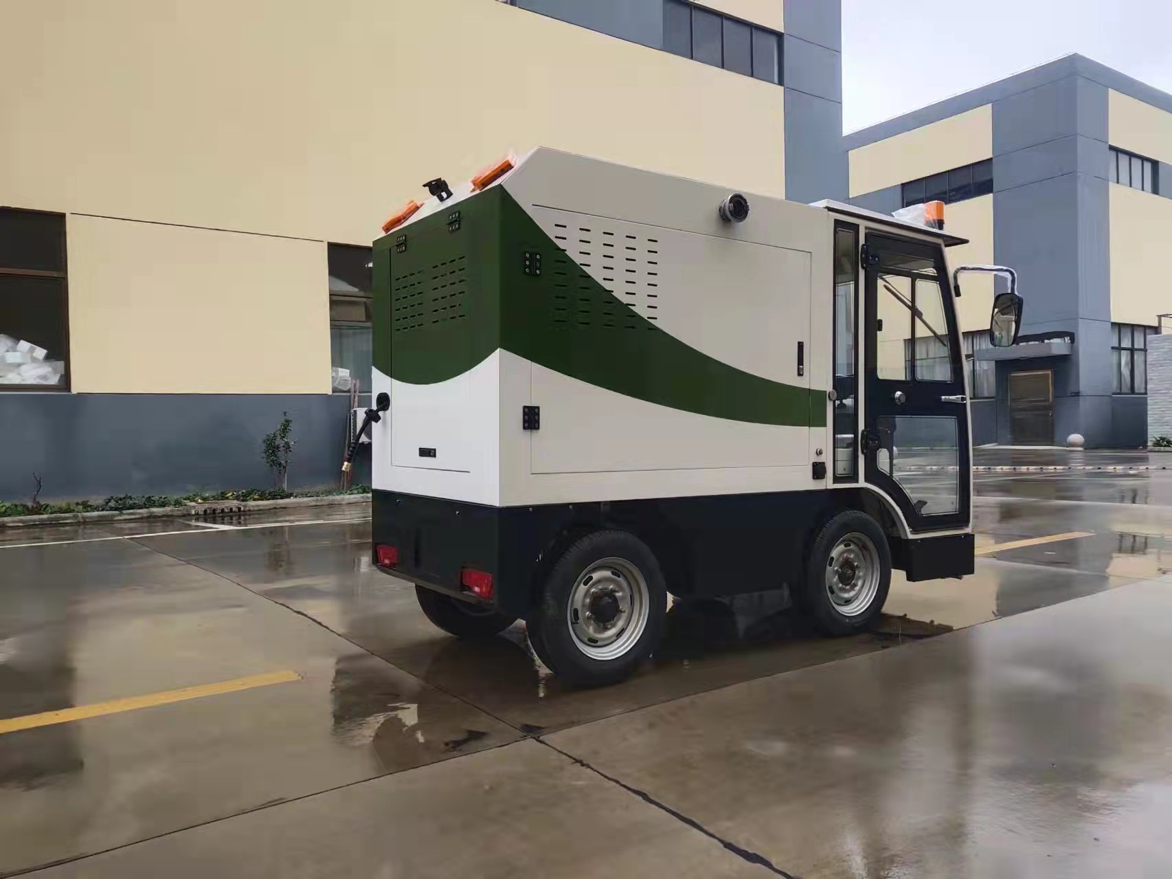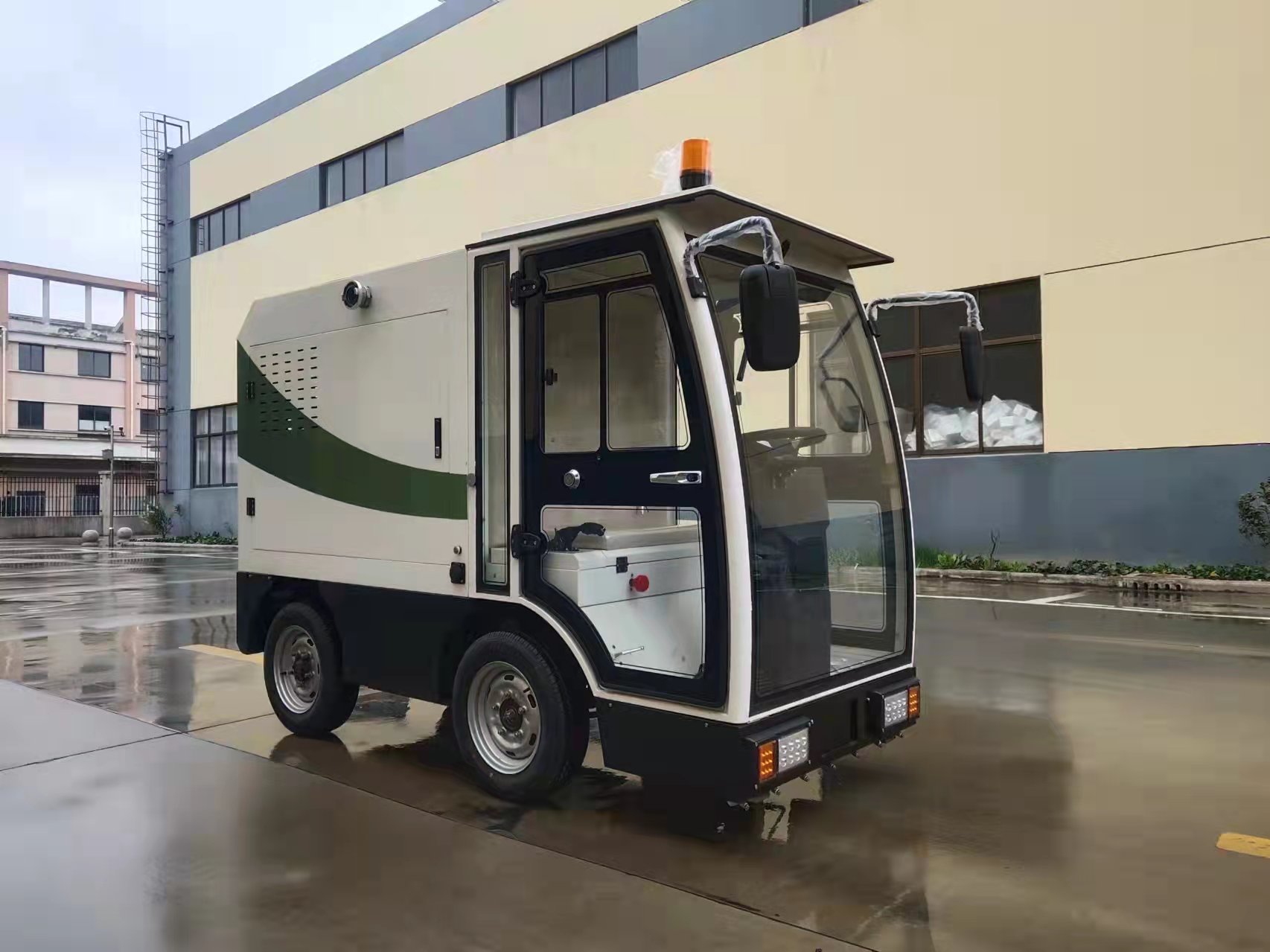 該產(chǎn)品為新能源車輛 ,車身為鈑金制作,方向座為滾塑材質(zhì),內(nèi)室軟包,配備茶杯架、手機架、滅火器、空調(diào)(選配)USB接口、倒車影像、組合儀表盤; 整車小巧靈活,機動性強,特別適用于城鎮(zhèn)街道、車站、機場、碼頭、工廠、學(xué)校、醫(yī)院、廣場、小區(qū)小巷、人行道等垃圾房、垃圾桶、果皮箱、路牙、護欄的清洗保潔。對“牛皮癬”、小廣告的清除同樣有效